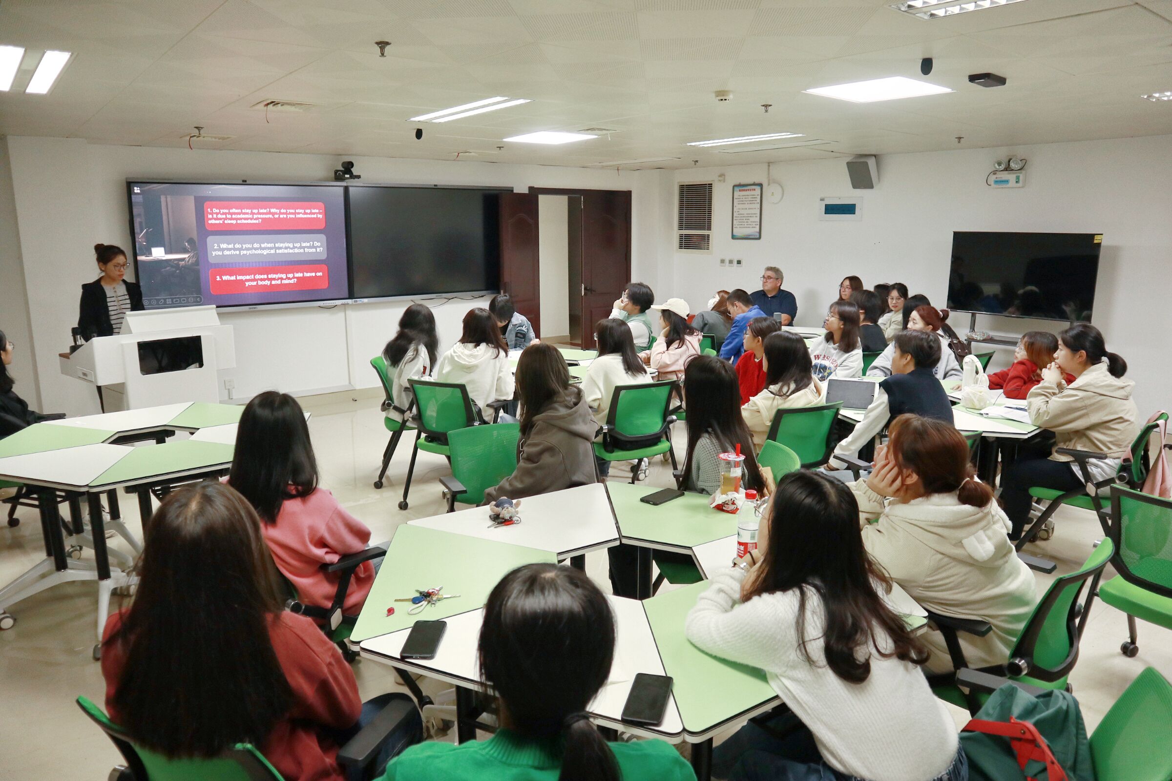 活动以同学们喜闻乐见的“作息健康”为话题,在一片热烈的讨论中渐入佳境。讨论环节中,同学们尽展青春风采,用流利的英语口语分享彼此的经历与观点;Jeff Morton从母语使用者的思维与表达方式出发,在话题讨论中与同学们积极互动,探讨交流,鼓励同学们注重作息规律,走向健康生活。良好的语言氛围鼓舞许多平时性格内向的同学们开口说英语,使他们敢于开口,勤于开口,在新颖有趣的游戏环节中进行口语实践锻炼,让英语口语水平更上一层楼。