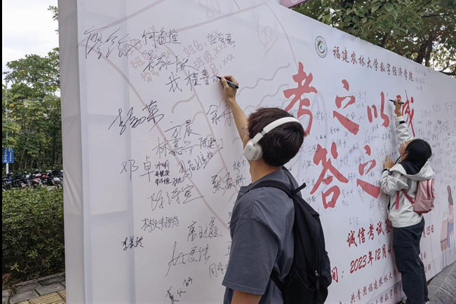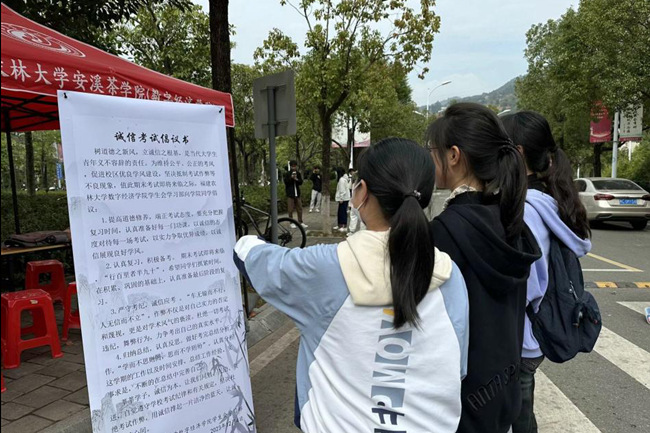 活动开始前,学院组织召开全体班级学习委员工作会议,集中学习诚信考试相关内容,强调诚信考试教育活动的重要性,并部署具体工作安排?;岷蟾靼嗉陡菀笳倏泄爻闲趴际缘闹魈獍嗷?,向同学们强调考场纪律,并签署诚信考试承诺书。期间,学院连续多日在大学生活动中心开展主题墙签名活动,号召全院学生考之以诚,答之以信。