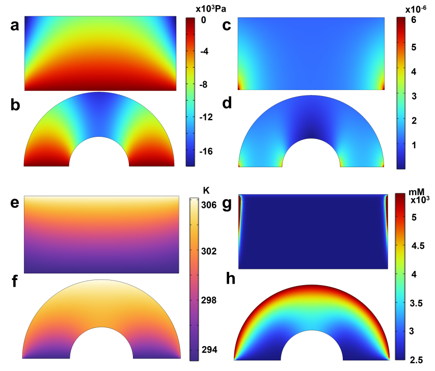 图5.(a) VBH-S蒸发器和(b) BH-A蒸发器的模拟水压分布,阐释毛细驱动输水机制。(c) VBH-S蒸发器和(d) BH-A蒸发器内部水流速分布的有限元分析(FEA)。(e) VBH-S蒸发器和(f) BH-A蒸发器的有限元模拟温度场分布,突显热局域化差异。(g) VBH-S蒸发器和(h) BH-A蒸发器周边的盐分分布有限元模拟,揭示盐离子输运与结晶行为的差异性。