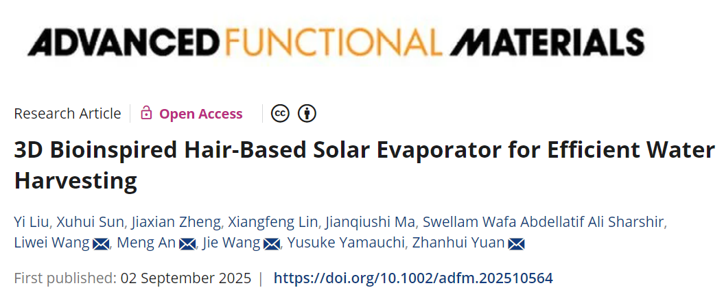 近日,福建农林大学材料工程学院袁占辉教授团队在国际材料类高水平SCI期刊Advanced Functional Materials (先进功能材料)上,在线发表了题为“3D Bioinspired Hair-Based Solar Evaporator for Efficient Water Harvesting”(用于高效海水淡化的3D头发基太阳能蒸发器)的创新性研究论文。福建农林大学硕士研究生刘易为第一作者,团队负责人袁占辉教授为第一通讯作者。