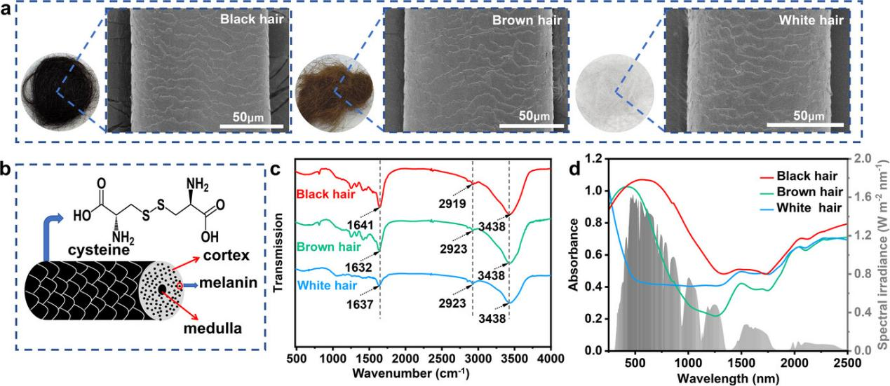 图2.(a) 黑发、棕发和白发的数码照片及扫描电镜(SEM)图像。(b) 人发分级微结构示意图,包括毛鳞片、皮质层和髓质层。(c) 黑发、棕发和白发的傅里叶变换红外光谱(FT-IR),对比分析其官能团组成的差异。(d) 黑发、棕发和白发的紫外-可见-近红外(UV-Vis-NIR)吸收光谱。