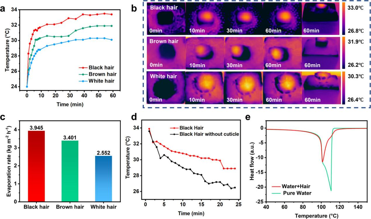 图3.(a) 基于黑发、棕发和白发的蒸发器在1倍太阳光强照射下的温度变化曲线。(b) 黑发、棕发和白发蒸发器照射后的红外热成像图。(c) 15 wt.%盐水中,在1.0 kW m?2光强照射下,黑发、棕发和白发蒸发器的蒸发速率对比(黑发蒸发器的蒸发速率取自图4a中第7小时的蒸发速率)。(d) 完整黑发与去鳞片(无毛鳞片结构)毛发的隔热性能对比。(e) 差示扫描量热法(DSC)分析对比毛发中水与纯水的蒸发焓,突显该头发基系统的节能效应。
