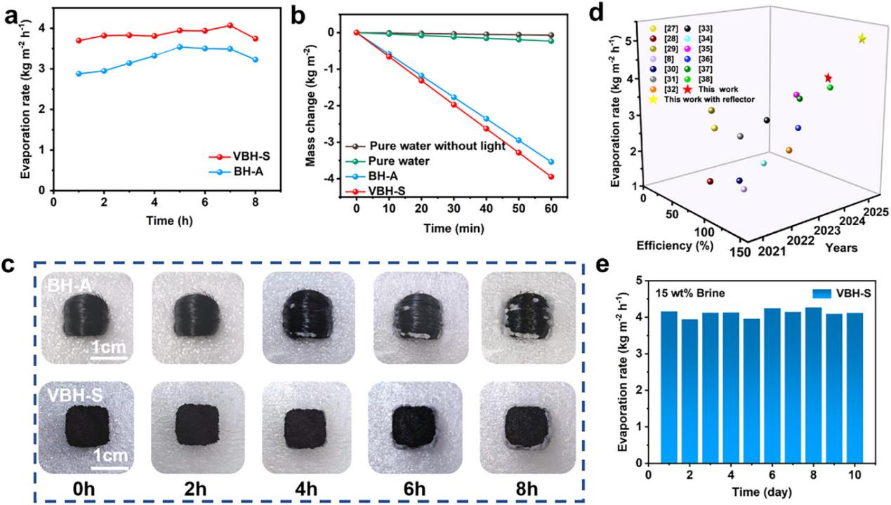 图4.(a) VBH-S蒸发器和BH-A蒸发器在15 wt.%盐水中,1.0 kW m?2光强照射下的蒸发速率变化。(b) VBH-S蒸发器、BH-A蒸发器以及纯水在有无光照条件下的水质量变化对比。(c) BH-A蒸发器和VBH-S蒸发器在长时间运行后的表面形貌对比。(d) 本工作VBH-S蒸发器与已报道的多种蒸发器系统的蒸发速率对比。(e)VBH-S 蒸发器在15 wt.% 盐水中超过10天的长期运行稳定性。