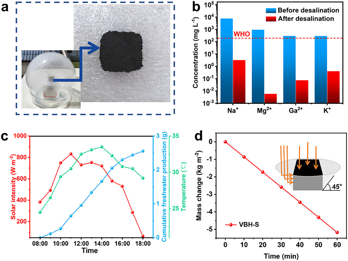 图6.(a) VBH-S 蒸发器在真实室外环境中部署的照片。(b) 海水在脱盐处理前后各种金属离子浓度,展示有效的离子脱除效果。(c) 户外运行期间,系统质量变化、太阳辐照度及温度的实时监测数据。(d) 配备截锥形铝制反射器的VBH-S蒸发器在1倍太阳光照下的质量随时间变化曲线。