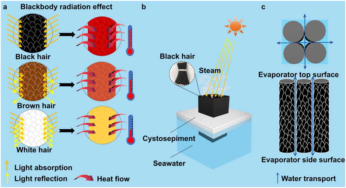 图1.(a) 黑发、棕发和白发在黑体辐射条件下的光吸收、反射及热流特性示意图。(b) VBH-S 蒸发器的结构示意图。(c) 蒸发器内部的输水路径图解。