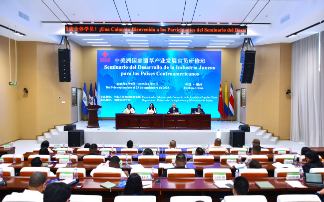 2025年9月9日,由商务部主办、福建农林大学承办的中美洲国家菌草产业发展官员研修班在国家菌草工程技术研究中心五楼会议室开班。福建农林大学党委书记赖海榕、洪都拉斯科马亚瓜省省长安娜·朱丽娅、国家菌草工程技术研究中心首席科学家林占熺出席开班式并致辞。来自洪都拉斯、古巴、多米尼加、哥斯达黎加、哥伦比亚和萨尔瓦多的30名学员参加研修班。