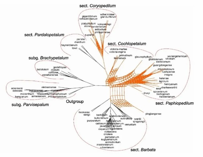 自1993年起,团队深入开展兰科植物种质资源调查与迁地?;ぃ⑵鸶哺敲婀?、保存完备的种质资源库,包含兰属、兜兰属和蝴蝶兰属所有的原生种。研究团队聚焦蝴蝶兰属、兰属、石斛属、兜兰属、独蒜兰属、虾脊兰属和指甲兰属等中国特色观赏类群,通过分子系统学研究厘清其系统发育关系,解决多项分类争议,首次揭示网状进化、种间渐渗、印度板块碰撞引发的喜马拉雅山脉隆升、中南半岛地质运动、季风系统与海平面变化是兰科植物物种多样化的关键驱动因子,也是这些类群高度多样性和生境适应的原因所在。团队首次对广义蝴蝶兰属7属共164个分类单元完成系统修订,整合形态与分子证据,建立4亚属6组的新分类系统,为种质资源鉴定、?;び肜玫於崾祷?。