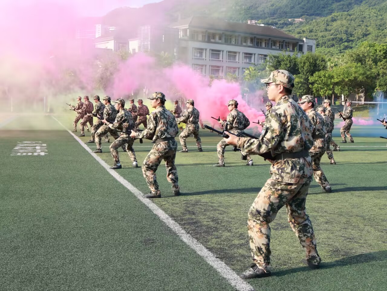 典礼由军训汇报表演拉开序幕,分列式方阵气势如虹,持枪方阵步伐铿锵有力,整齐的队列与挺拔的身姿尽显纪律与担当;匕首操方阵动作利落,彰显了青春活力;军体拳方阵招式标准,展现出刚劲风采。特色科目轮番上演,亮点纷呈,展现出2025级新生的昂扬风貌。