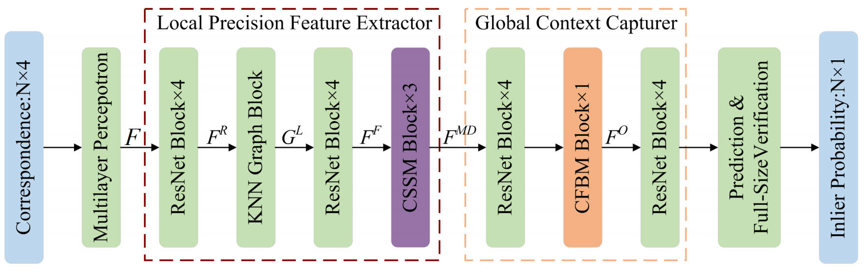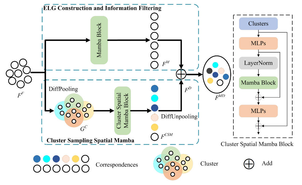 为了解决这些问题,本文提出了一种基于选择性状态空间模型的新型对应修剪网络(MatchMamba),如图1所示。所提出的MatchMamba将GNN强大的图特征提取能力与Mamba的选择机制和高效的全局上下文捕获能力相结合。它缓解了GNN在信息传播过程中的过度平滑问题,并以适当的复杂性捕获全局上下文。具体来说,我们首先使用GNN显式构建一个局部邻居图,并引入聚类采样空间Mamba(CSSM)块来捕获细粒度的局部上下文,如图2所示。CSSM通过软分配将节点映射到一系列粗略的集群中,并使用Mamba的选择机制动态过滤和处理局部上下文。它删除不相关的信息,并根据每个邻域的相关性进行自适应聚合,同时更新隐藏状态,从而保留关键的局部上下文,并解决图构建后过度平滑的问题。此外,为了适应对应数据的无序性和非因果性,我们设计了对应翻转的双向Mamba(CFBM)块。CFBM对对应序列进行正向和反向扫描,使每个对应都能充分学习其他对应的特征,并以适当的复杂性捕获全局上下文。如图3所示,所提出的MatchMamba能够有效地识别内点、剔除离群点,并在多个公共数据集上实现了最先进的性能。