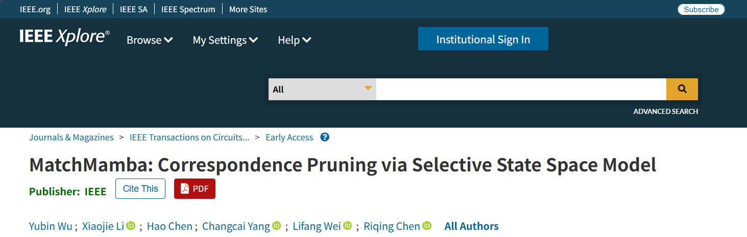 近日,福建农林大学计算机与信息学院、农林人工智能研究院、智慧农林福建省高校重点实验室杨长才课题组在国际人工智能领域高水平SCI期刊IEEE Transactions on Circuits and Systems for Video Technology(美国电气电子工程师学会视频技术电路与系统汇刊)上发表题为“MatchMamba:Correspondence Pruning via Selective State Space Model(基于选择状态空间模型的对应剪枝方法)”的研究论文。福建农林大学硕士研究生吴煜彬为第一作者,课题组负责人杨长才副教授为唯一通讯作者。