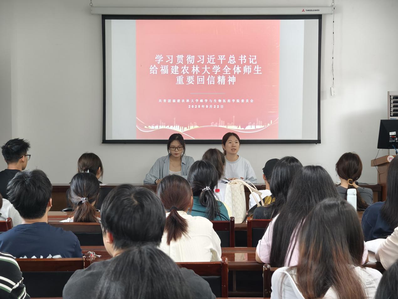 9月22日中午,蜂学与生物医药学院团委组织团学骨干及各班级代表在生药楼102教室开展专题学习会议,传达学习习近平总书记给福建农林大学全体师生的重要回信精神,会议由学院辅导员许惠、林安淇共同主持。