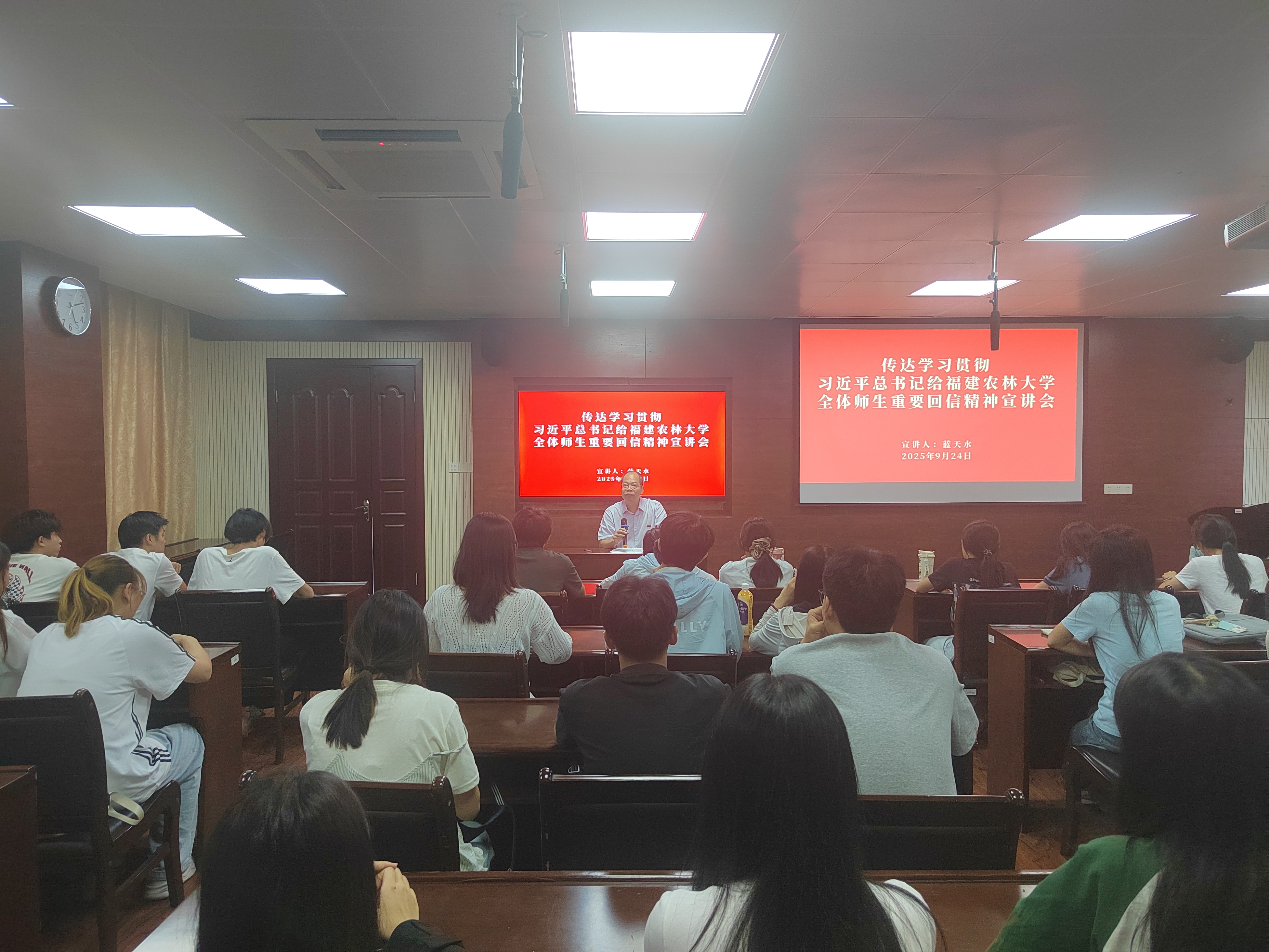 在宣讲中,学院领导原原本本、逐字逐句传达了习近平总书记9月20日给福建农林大学全体师生的重要回信,以及9月21日福建省委书记周祖翼同志专程莅校宣读并与我校师生代表共同认真学习贯彻重要回信精神时对我校建设发展提出的具体要求、9月22日福建省委书记周祖翼同志在主持召开省委常委会会议时的讲话精神,传达学习了校党委关于做好学习宣传贯彻重要回信精神的工作部署和具体要求。