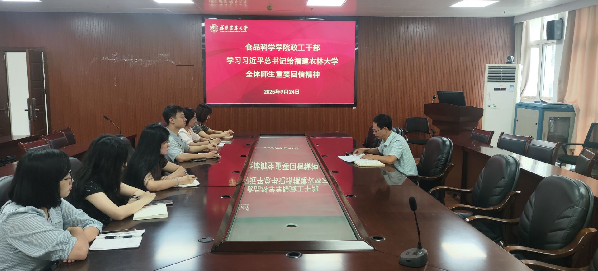 9月24日,食品科学学院召开政工干部会议,专题学习研讨习近平总书记给福建农林大学全体师生的重要回信。学院全体政工干部参加,会议由学院党委副书记吴有平主持。