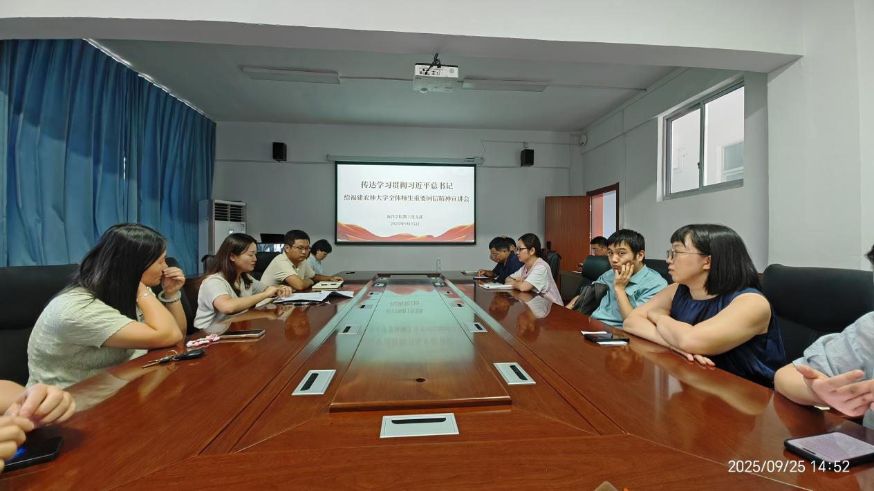 院领导结合学院“十五五”规划和当前重点工作,就如何将重要回信精神转化为推动学院各项事业发展的实际行动,与师生们进行了深入探讨。广大师生反响热烈,大家一致表示,要将重要回信精神转化为干事创业的动力,以实际工作成效回报习近平总书记的关心厚爱。学院党委将持续通过理论学习中心组学习、“三会一课”、主题党日团日、党支部活动、座谈会等形式深入学习贯彻习近平总书记给福建农林大学全体师生的重要回信精神,引导全体师生牢记嘱托、奋勇争先,用创新科技耕海牧鱼,为我校争创国家“双一流”,为推进乡村振兴和建设海洋强国积极贡献智慧力量。