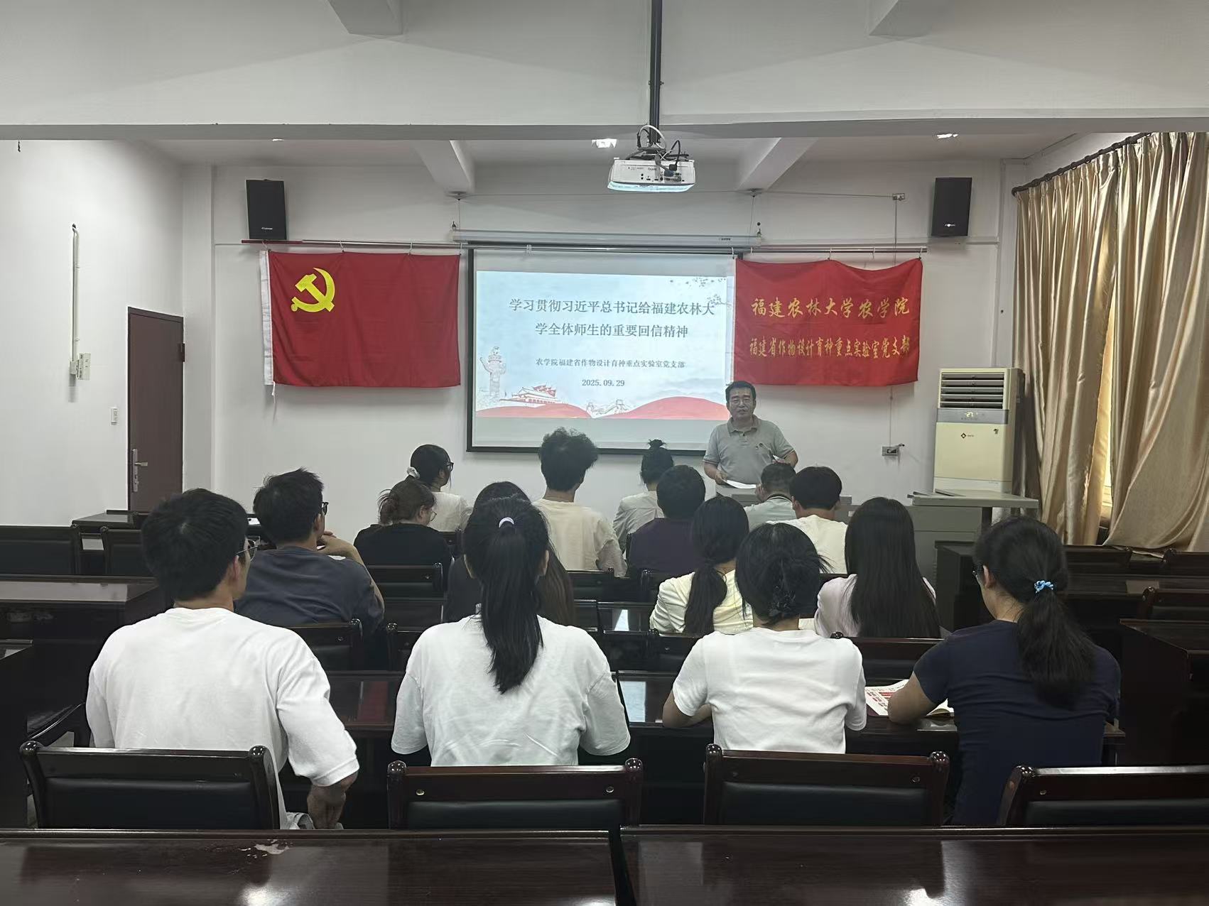 为持续掀起学习宣传贯彻习近平总书记给福建农林大学全体师生重要回信精神的热潮,推动重要回信精神在学院落地生根、见行见效。近日,农学院党政领导班子成员深入学院系所、科研团队及师生党支部、班级,集中开展专题宣讲活动,实现了学院基层单位宣讲全覆盖,确保习近平总书记的殷切嘱托和上级党委的部署要求传达到每一位师生。