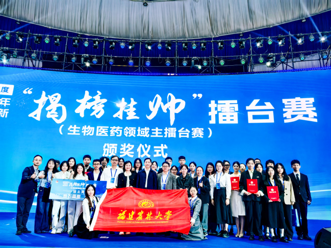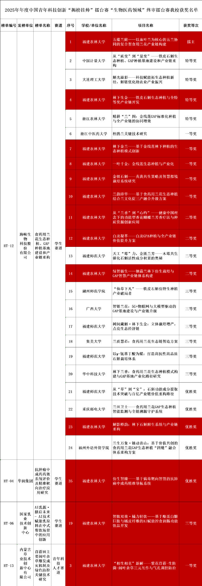 牢记嘱托,奋勇争先。在全校师生深入学习贯彻习近平总书记给学校全体师生重要回信精神之际,我校师生在第十九届“挑战杯”竞赛2025年度中国青年科技创新“揭榜挂帅”擂台赛“生物医药领域”终审擂台赛过关斩将、展现风采、荣获佳绩,实现我?;窠钡燃队胧坷沸峦黄?。学校首次夺得擂主,13件入围作品悉数斩获奖项,其中擂主1个、特等奖1个、一等奖5个、二等奖3个、三等奖1个、优胜奖2个。特别是在“HT-12食药用兰花生态种植、GAP种植基地建设和产业链重构”榜题中,勇夺擂主单位,充分彰显我校在兰科植物研究的深厚积淀。比赛期间,校党委副书记曾华平一行专程前往关心看望并指导参赛师生。