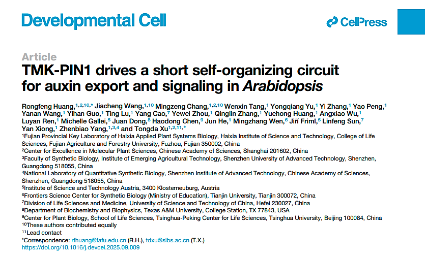 近日,我校海峡联合研究院徐通达教授团队在《发育细胞》Developmental Cell期刊发表了题为TMK-PIN1 drives a short self-organizing circuit for auxin export and signaling in Arabidopsis (TMK和PIN1形成最小化的自组织回路协同调控生长素外排与信号转导) 的研究论文,揭示了生长素信号传导与极性运输的自组织机制和植物稳健发育的深层调控逻辑。