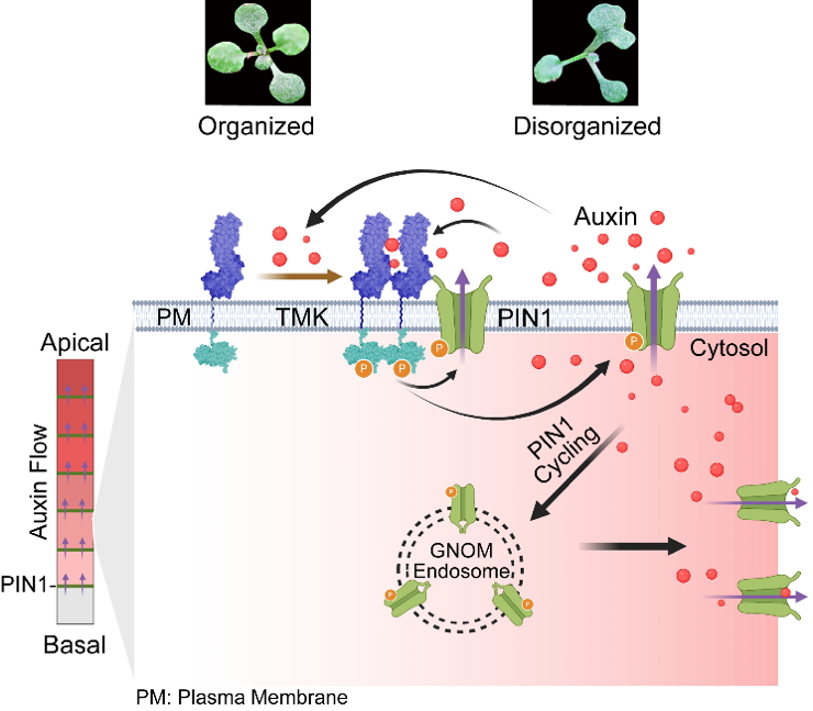 该研究揭示了生长素信号感知与运输的核心耦合机制:生长素转运蛋白PIN1与受体激酶TMK在细胞膜上形成“感知-转运”二元复合体,且该复合体的组装受生长素直接诱导。综合生化、细胞及遗传学证据表明,生长素通过TMK激酶磷酸化修饰PIN1,从而精确调控PIN1的极性分布与转运活性;而磷酸化激活的PIN1通过外运生长素,进一步强化TMK信号通路,在空间布局上形成自我强化“生长素-TMK-PIN1”正反馈循环。该回路驱动从细胞伸长到器官形成等关键发育过程。研究最终阐明,生长素通过整合其信号感知(TMK)与极性运输(PIN1)两大核心??椋菇艘桓鲎宰橹骺叵低?,从而维持植物发育的程序与秩序。