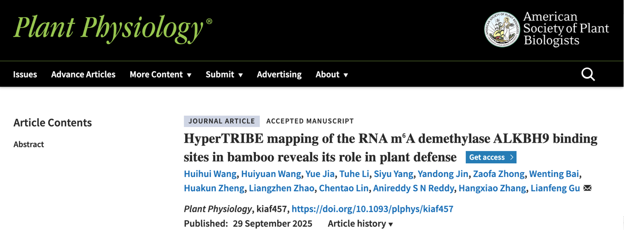 近日,福建农林大学海峡联合研究院顾连峰课题组在《植物生理》Plant Physiology期刊发表了题为 “HyperTRIBE mapping of the RNA m6A demethylase ALKBH9 binding sites in bamboo reveals its role in plant defense” 《利用HyperTRIBE技术绘制毛竹RNA m6A去甲基化酶ALKBH9结合位点揭示其在植物防御中的作用》的研究论文,揭示了毛竹m6A去甲基化酶ALKBH9对生物胁迫的调控作用。