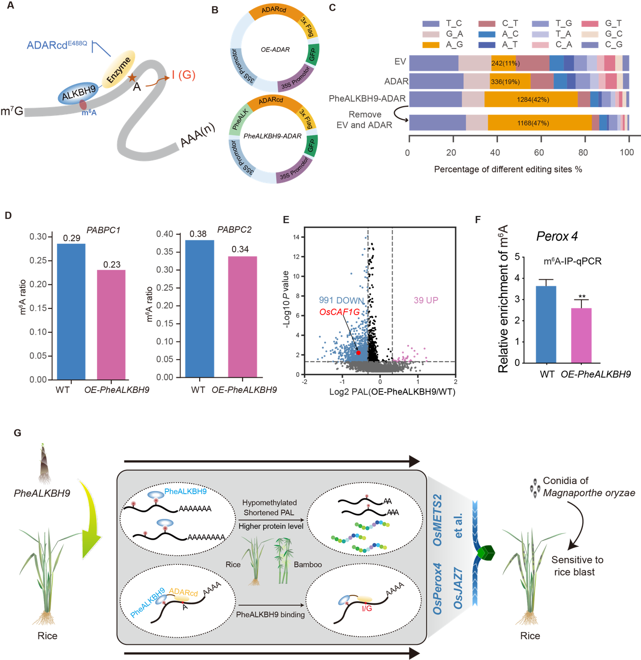 本研究鉴定了毛竹的m6A去甲基化酶PheALKBH9,证实了其擦除m6A修饰的功能,并发现PheALKBH9 调控植物对生物胁迫的响应。为揭示其调控机制,本研究通过HyperTRIBE (Targets of RNA-binding proteins Identified By Editing)技术 (图1),将RNA编辑酶(ADARcdE488Q)与PheALKBH9的C端进行融合,在过表达材料中根据RNA上腺苷(A)转变为肌苷(I)的编辑事件,揭示了PheALKBH9在毛竹和水稻中结合的靶标RNA,并发现在禾本科中存在一定的保守性。PheALKBH9可直接结合CAF1G和PABPC1及PABPC2的转录本,解释了PheALKBH9过表达所导致的基因整体的poly(A)尾巴长度变化原因。特别是发现PheALKBH9可与抗病相关基因Perox4的转录本结合,并去除其m6A修饰,提升Perox4的基因表达与蛋白表达,从而影响生物胁迫(图1)。本研究揭示了毛竹m6A去甲基化酶PheALKBH9在植物响应生物胁迫过程中的关键作用,为利用毛竹m6A修饰功能基因进行禾本科植物的遗传改良提供了重要的理论依据。