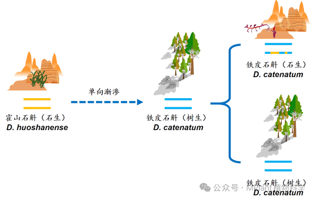 2025年10月13日,Plant Communications在线发表了福建农林大学兰思仁教授与刘仲健教授团队及其合作者的研究成果,论文题为“Unidirectional genomic introgression facilitates the colonization of invasive orchid in arid metal-enriched sedimental habitats”。该研究揭示,铁皮石斛(Dendrobium catenatum,亦称D. officinale)在向东扩散过程中与霍山石斛(D. huoshanense)发生杂交,从而获得了后者在石上附生相关的功能基因。这一渐渗事件使得原本附生于树木的铁皮石斛成功开拓并占据了干旱且富含金属的沉积岩生境。该研究增进了我们对植物种间渐渗在极端环境适应中分子机制的理解。