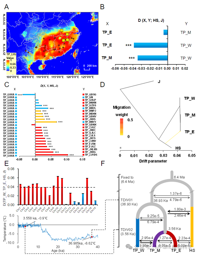 为明确渐渗方向,研究分别基于1号染色体的编码区与非编码区数据,对Model I(HS向TP_E渐渗)与Model O(TP_E向HS渐渗)进行比较分析。结果显示,两类数据集均支持基因由霍山石斛单向流向铁皮石斛东部生态群。进一步利用fastsimcoal2进行的群体历史模拟表明,约在3.7万年前,铁皮石斛从中国西南扩散至中、东部地区,导致其西部生态群(TP_W)与东、中部共同祖先发生分化;约在3.6千年前,东、中部共同祖先在占据丹霞地貌后进一步分化为两个生态群(图3)。