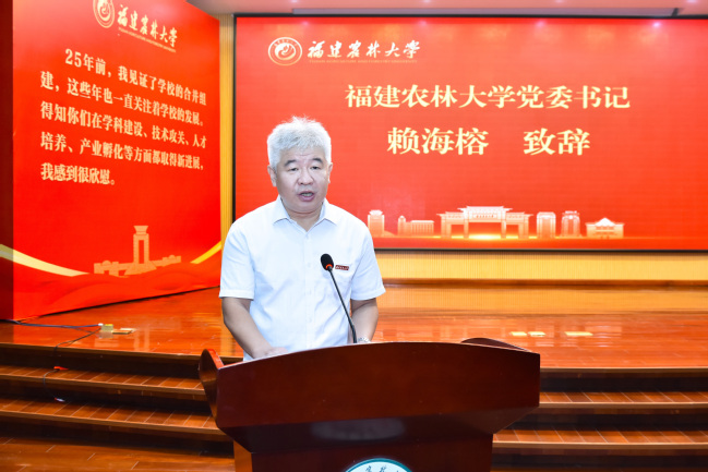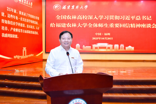 赖海榕在致辞中指出,习近平总书记先后给福建农林大学及中国农业大学全体师生回信,这两封回信饱含深情、充满关爱,高瞻远瞩、指引方向,充分体现了总书记对涉农高校、对农林教育的高度重视和亲切关怀,为新时代高等农林教育改革发展注入了强大动力,指明了前进方向,提供了根本遵循。这不仅是对两所高校师生的巨大鼓舞,更是对全国农林教育战线和广大“三农”工作者的深切勉励与殷切期望。他表示,学校将以习近平总书记重要回信为指引,牢记殷殷嘱托,坚定不移落实立德树人根本任务,努力培养造就更多热爱“三农”事业、富有创新精神和实践能力的高素质人才;发挥特色优势,坚定不移走好内涵式高质量发展道路,不断提升学校办学质量和综合实力;扎根“三农”沃土,坚定不移提升服务经济社会高质量发展质效,努力在农业和农村经济建设中起到“无处不在”的作用。他期待,与兄弟院校一道,同题共答“农业强国建设、农林高校何为”的时代答卷,为推进乡村振兴、建设农业强国作出新的更大贡献。