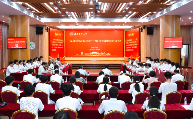 10月20日下午,福建农林大学合并组建25周年座谈会在福州仓山校区常盛会议中心召开,邀请亲历学校合并组建的校级老领导、校友代表以及师生代表共同参与这场跨越25年的特殊聚会,回顾学校合并组建25年的办学历史和奋斗历程,畅叙学校未来发展,为学校在新征程上开创“四个基地”建设新局面提出宝贵意见建议、擘画发展新方向。省政协原副主席、时任副校长陈绍军,省教育厅原副厅长、时任校党委书记王豫生,时任校长郑金贵,时任常务副校长洪伟,省农科院原院长、时任副校长尤民生,省人大农业与农村委员会副主任委员、闽江学院原院长、曾任副校长王宗华,原副校长郑郁善、黄炎和等校级老领导,校党委书记赖海榕、校长兰思仁、校党委副书记陈世奎出席座谈会?;嵋橛沙率揽鞒?。