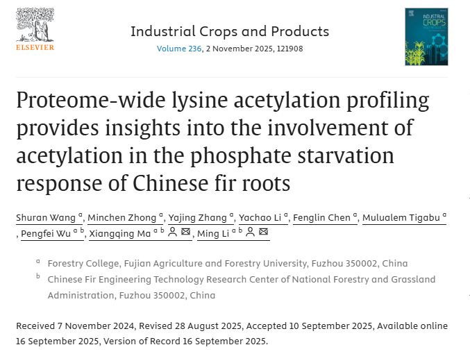 2025年9月16日发表于《Industrial Crops and Products》(工业作物与产品)的论文《Proteome-wide lysine acetylation profiling provides insights into the involvement of acetylation in the phosphate starvation response of Chinese fir roots》(蛋白质组水平赖氨酸乙?;治鼋沂疽阴;奘卧谏寄靖盗准⒍鱿煊χ械淖饔茫?,首次通过乙?;奘巫檠Х治觯谏寄靖抵屑ǖ?01个乙?;坏恪?85个差异修饰蛋白,发现“TCA循环、糖酵解和ABA信号通路”中关键酶(如ACO、SnRK2、MPK6等)的乙?;皆诹仔财认路⑸浠?。该研究从蛋白质翻译后修饰的全新视角,揭示了杉木应答低磷胁迫的深层调控网络,为解析杉木磷信号感知与代谢重塑提供了分子基础,也为通过修饰调控培育高抗逆杉木品种开辟了新路径。