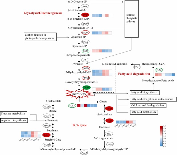 图3. Diagram of acetylated proteins in TCA cycle, Glycolysis/Gluconeogenesis and fatty acid degradation pathways(低磷胁迫下杉木根系TCA循环、糖酵解/糖异生及脂肪酸降解通路中差异表达的乙?;奘蔚鞍祝?/p>
