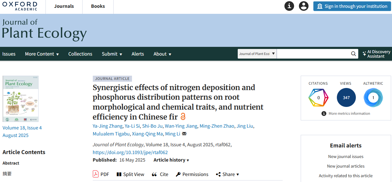 2025年5月16日发表于《Journal of Plant Ecology》的论文《Synergistic Effects of Nitrogen Deposition and Phosphorus Distribution Patterns on Root morphological and chemical traits, and Nutrient Efficiency in Chinese Fir》(氮沉降与磷分布互作对杉木根系形态化学特性及养分效率的调控机制),通过模拟氮沉降(低N:48 kg·hm-2·a-1;高N:180 kg·hm-2·a-1)与磷空间分布格局(均质低磷 vs. 异质低磷),探究三种杉木无性系的生长与代谢调控规律,发现氮沉降通过“形态-酶促”轴重构根系养分觅食策略,且磷高效无性系优先通过根系增殖(而非有机酸分泌)利用空间异质性磷资源。