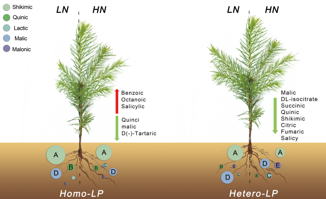 研究发现,在异质磷环境下,高氮沉降显著提升了杉木的地上与地下生物量,磷高效无性系尤为突出,其根长与根表面积明显增加。高氮沉降还诱导根系酸性磷酸酶(APase)活性增强,但抑制了有机酸总分泌量,该效应在均质低磷条件下更为显著。代谢组学分析进一步表明,氮输入重塑了根系分泌物组成:乳酸、丙二酸、琥珀酸和草酸比例上升,而莽草酸、奎宁酸与苹果酸下降。磷高效无性系主要依赖根系形态可塑性(如根长与表面积)以提升磷吸收效率(PAE);磷敏感无性系则更多依靠酶促磷活化策略,但生物量积累受限。研究还发现,高氮条件下氮吸收效率(NAE)与PAE具有显著协同效应。据此,研究团队提出建议:(1)在高氮沉降区优先选育磷高效杉木无性系,以提高林分生产力;(2)构建异质磷分布的针阔混交林,以增强生态系统养分弹性。该研究为亚热带酸化土壤杉木人工林的精准育林与可持续经营提供了重要理论依据。