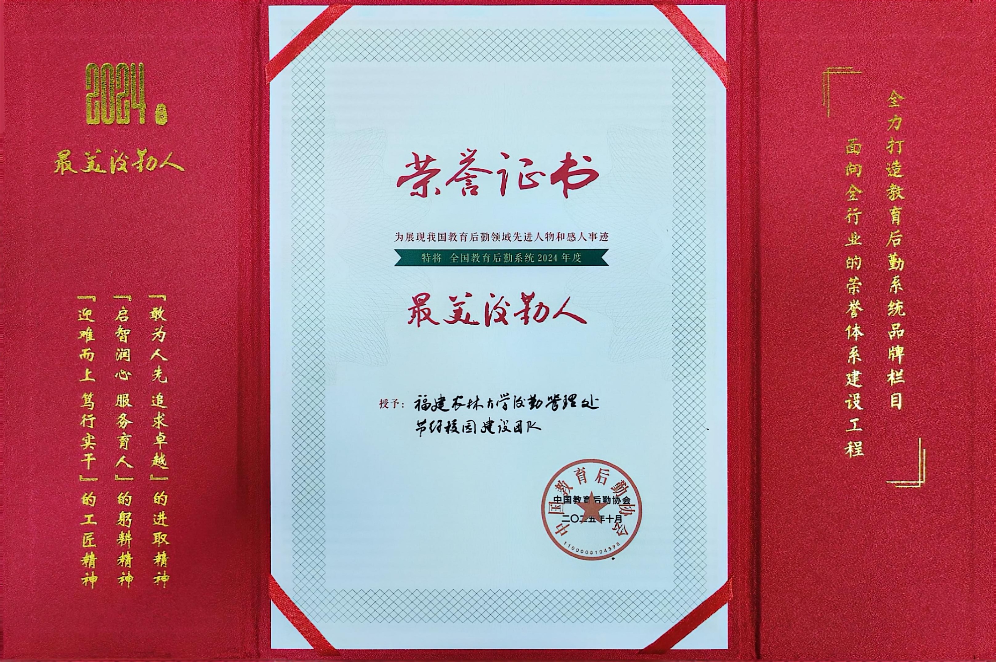 近日,中国教育后勤协会第三次会员代表大会在北京召开,我校后勤管理处节约校园建设团队被中国教育后勤协会授予全国教育后勤系统2024年度“最美后勤人”荣誉称号。