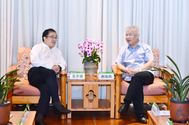 赖海榕代表学校对雷春雄一行的到来表示欢迎。他指出,周宁是习近平总书记“三库+碳库”重要生态理念的首倡地和先行实践地,森林资源丰富,农业特色鲜明,与福建农林大学的学科优势高度契合。他简要介绍了福建农林大学的优势和特色,学校牵头制定了白茶与青茶(乌龙茶)两项国际标准,构建了从育种栽培、精深加工、品质提升到品牌建设、产品营销的茶叶全产业链科研与人才培养体系,选育的蔬菜、花卉等新品种推广至全国主要产区,在杉木高效培育、松材线虫防治等关键技术领域取得重要突破。当前学校正深入学习贯彻落实习近平总书记给福建农林大学全体师生的重要回信精神及省委提出的具体要求,将充分发挥学科、人才和平台优势,立足周宁资源禀赋,紧密对接周宁发展需求,在技术指导、项目合作、产业孵化、人员培训等领域深化合作,把更多好技术送到田间地头,为推进乡村振兴、农业农村现代化贡献智慧和力量。