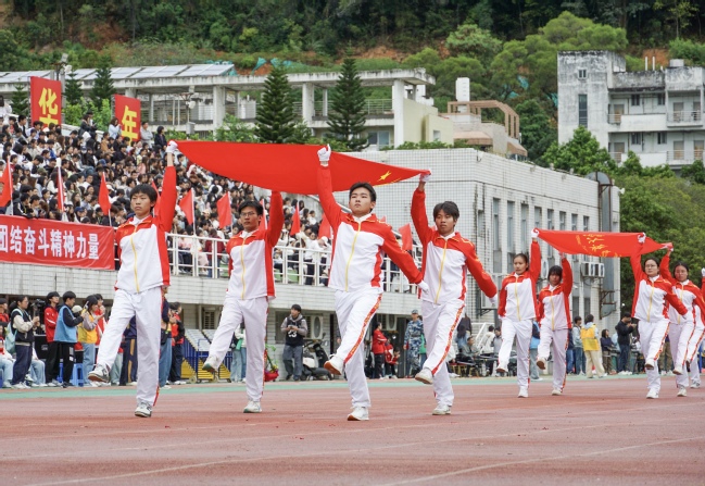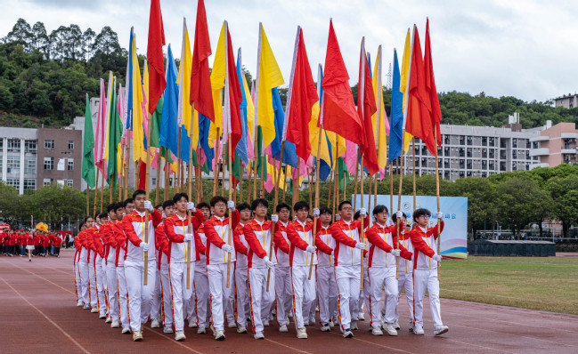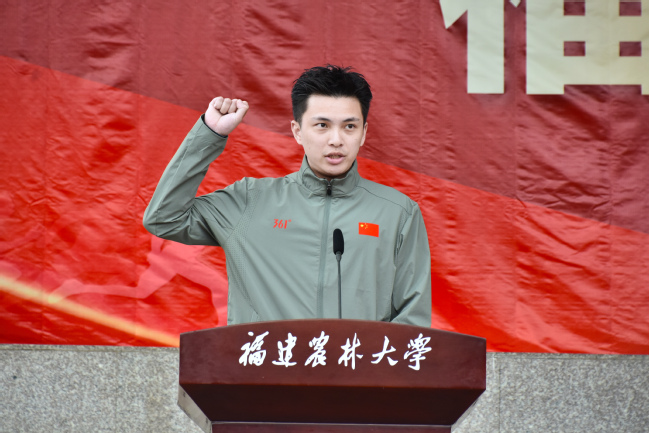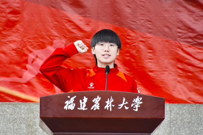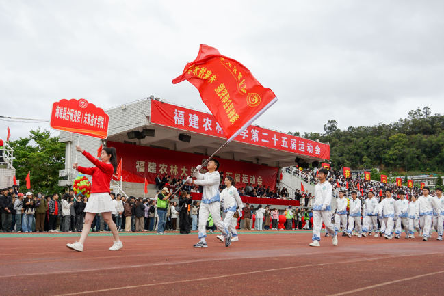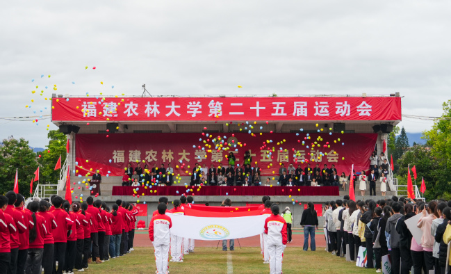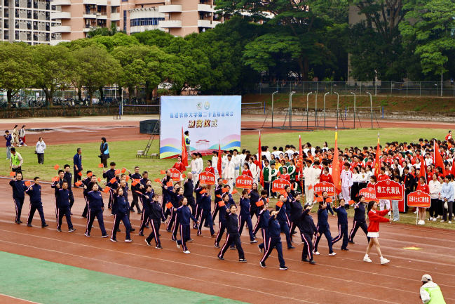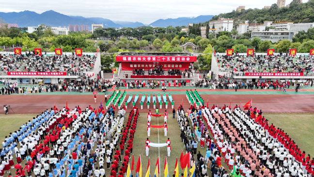赖海榕在致辞中代表福建农林大学向精心筹备本届运动会的全体工作人员、教练员、裁判员表示衷心感谢,向刻苦训练、积极备战的全体运动员致以亲切问候和美好的祝愿。他指出,体育强则青年强,青年强则中国强。体育运动所淬炼出的超越自我、永不言败、团结协作的体育精神,既能让人终身受益,更能使民族屹立不倒。今年是学校奋力推进“双一流”建设的关键之年,也是我校体育事业蓬勃发展、捷报频传的丰收之年。我校运动健儿们在省级、国家级的竞技舞台上高歌猛进,为学校赢得了赫赫声威。年初至今,我校参加省级及以上体育赛事,共斩获奖牌 71 枚,其中金牌 33 枚、银牌 23 枚、铜牌 15 枚。这是农林大学子“敢于争先、勇于突破”的生动写照,也正是我们奋进“双一流”最迫切需要的精神内核。他希望,广大师生以此次运动会为契机,强体魄、铸精魂,将赛场上的拼搏精神、团队意识和顽强意志,带到日常的学习科研之中,融入学校发展的各项事业中去,奋楫争先、勇立潮头,用实际行动跑好我们这一代人的“接力棒”。