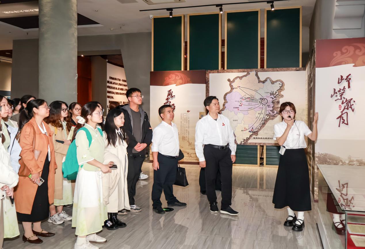 黄成茂带领师生一行循着“初心—传承—创新—守廉”的主线,依次参观“习近平总书记关心指导福建农林大学建设发展”专题展厅、校史馆、江一真专题展厅、严复两岸农业科教馆及廉政文化教育基地。