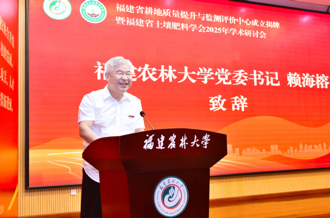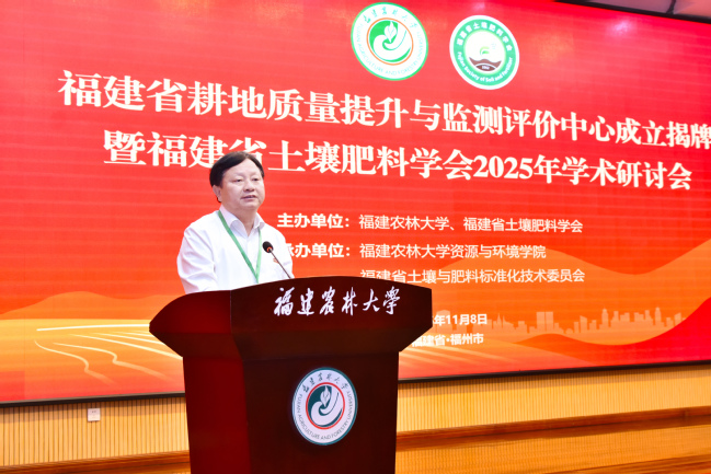赖海榕在致辞中与大家共同学习了习近平总书记给福建农林大学全体师生的重要回信精神,回顾了学校在习近平同志亲自擘画、亲力推动合并组建25年来所取得的建设发展成效。他指出,长期以来,我校聚焦国家耕地?;ふ铰?,依托“福建省土壤环境健康与调控重点实验室”等创新平台,构建了从基础研究到技术推广的完整链条?!案=ㄊ「刂柿刻嵘爰嗖馄兰壑行摹钡慕遗瞥闪ⅲ唤鍪茄Q肮岢瓜敖阶苁榧侵匾匦啪?、贯彻落实李强总理对推进农田水利和高标准农田建设工作作出的重要批示精神、服务粮食安全与乡村振兴的实质性举措,也标志着我校在耕地质量科学研究与治理能力建设上迈入了新的阶段。他期待,以此次揭牌活动和学术盛会为契机,凝聚各方智慧和力量,进一步筑牢耕地质量“数字底座”,构建“天空地”一体化监测网络;进一步构建低碳农业技术体系,突破南方酸化瘠薄耕地治理瓶颈;进一步打造农资人才培养高地,加快培育更多耕地保护和治理领域的高素质农林人才,为推动现代农业高质量发展和乡村全面振兴做出新的更大贡献。